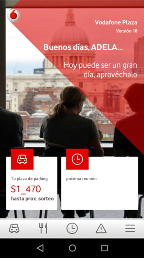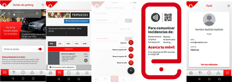 La aplicación Smart Building de Vodafone es una solución al servicio de los empleados. A través de una sencilla APP, el usuario tiene la capacidad de pedir una plaza de Parking, reservar una sala, ver la ocupación del comedor en tiempo real, poner una incidencia e incluso cambiar su perfil. Hemos conseguido de una forma ágil y sencilla, la mejor relación del usuario con el edificio, así como la optimización de todos los recursos del mismo disponibles para los empleados. El resultado es una mayor satisfacción del usuario, optimización de costes y una información fundamental para la toma de decisiones de servicios y espacios. Esta aplicación actualmente se está utilizando en la Sede central de Vodafone España en Madrid.