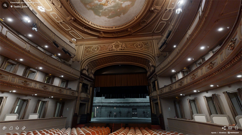 Los usuarios pueden acceder al gemelo digital clicando sobre el teatro Jofre y desplegando el icono 3D. Desde allí se inicia la navegación desde la Plaza de Galicia para acceder al teatro. Una vez dentro del gemelo digital, la experiencia es total desde cualquier punto, con acceso al patio y a la grada por todas las puertas.