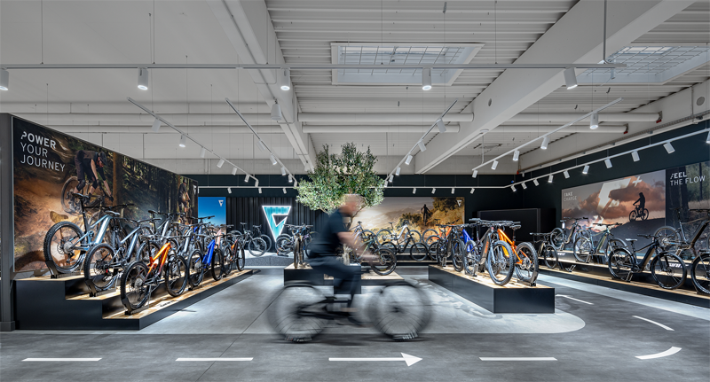 El concepto de iluminación está diseñado para guiar intuitivamente a los clientes por la zona de ventas y crear un ambiente que los invite a quedarse, eligiendo el color de la luz que realce al máximo los colores del cuadro de las bicicletas. Para ello, cada bicicleta de alta gama está iluminada por al menos dos focos VIVO II de Zumtobel, uno para la vista superior y otro para la vista lateral. De esta forma, los acabados con revestimientos con efectos metálicos y transiciones especiales de las bicicletas se hacen más visibles cuando la luz incide sobre el cuadro desde diferentes ángulos.