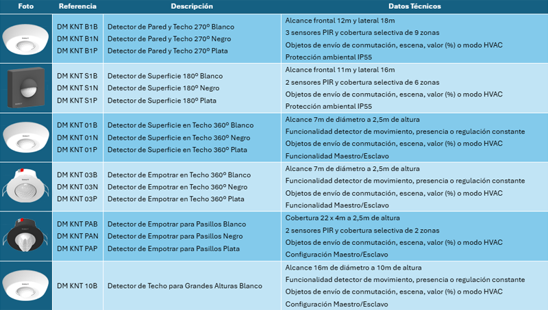 En el caso del modelo DM KNT S1X, el detector tiene un alcance de 11 metros frontal y 16 metros lateral. Además, dispone de dos sensores PIR y una cobertura selectiva de seis zonas. Por su parte, el modelo DM KNT B1X proporciona un alcance mayor, de 12 metros frontal y hasta 18 metros lateral. Asimismo, este dispositivo integra 3 sensores PIR y ofrece hasta nueve zonas de cobertura selectiva. Ambos modelos están disponibles en los acabados blanco, negro y plata.