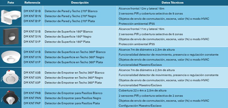 En el caso del modelo DM KNT S1X, el detector tiene un alcance de 11 metros frontal y 16 metros lateral. Además, dispone de dos sensores PIR y una cobertura selectiva de seis zonas. Por su parte, el modelo DM KNT B1X proporciona un alcance mayor, de 12 metros frontal y hasta 18 metros lateral. Asimismo, este dispositivo integra 3 sensores PIR y ofrece hasta nueve zonas de cobertura selectiva. Ambos modelos están disponibles en los acabados blanco, negro y plata.