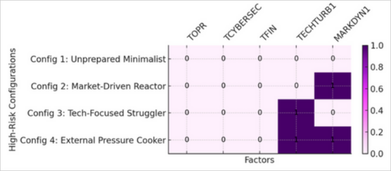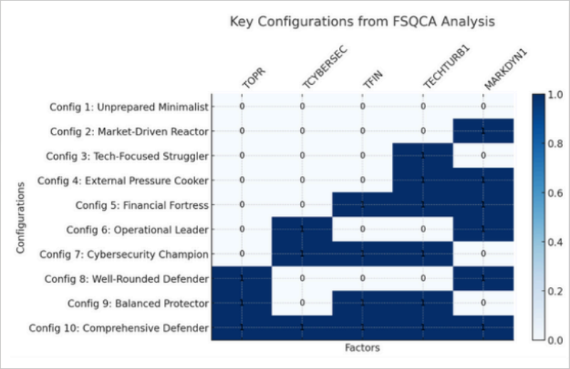 Estos escenarios, descritos en detalle en el informe, reflejan organizaciones que, aunque puedan tener infraestructura tecnológica avanzada, carecen de una base sólida en ciberseguridad interna. En estos casos, las brechas de seguridad son más comunes debido a la falta de planificación proactiva, la insuficiente capacitación del personal y la dependencia de factores externos para la toma de decisiones. El análisis fsQCA realizado en el informe revela diversos factores significativos que desempeñan un papel crucial en la determinación de la preparación de las organizaciones en términos de ciberseguridad.