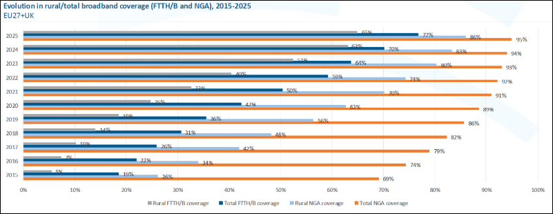 Otro aspecto positivo que se destaca en el informe es el progreso en la conectividad rural. En los países de la UE27 más el Reino Unido, aproximadamente el 65% de los hogares rurales ahora están conectados a redes FTTH/B, lo que representa un incremento de unos dos puntos porcentuales en comparación con el año pasado. Este avance es el resultado de los programas de financiación pública y las iniciativas de despliegue dirigidas a las áreas más complejas y desatendidas, que históricamente han sido las últimas en recibir acceso a internet de alta velocidad.